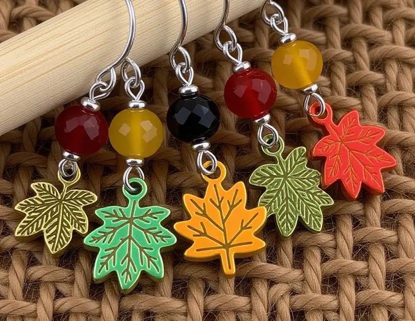 Step into a whimsical fall with vibrant leaf-shaped markers in reds, yellows, and greens, paired with gleaming garnet and amber beads. Perfect for cozy projects, they glide effortlessly. Let them guide your needles with autumn whimsy.